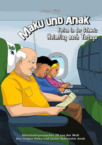 Leider sind die Ferien in der Schweiz vorbei. Grossvater, Maku und Anak fliegen heute mit einem lachenden und einem weinenden Auge nach Hause auf die Insel Tortuga. Nach ihrem letzten Frühstück, das sie besonders genossen haben, fahren die drei zum Flughafen Zürich, wo sie problemlos einchecken und ihr Flugzeug besteigen können. Damit es ihnen während des Flugs nicht langweilig wird, hat Grossvater ein paar Spiele vorbereitet. Was mögen das wohl für Spiele sein?