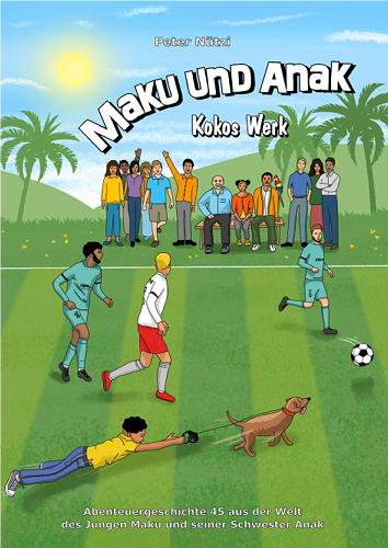 Grossvater, Maku, Anak, sowie Onkel Dizi mit Spitschi auf der Schulter schauen auf dem Fussballplatz ein Spiel ihrer Heimmannschaft. Koko an Grossvaters Leine ist ganz unruhig. Plötzlich springt er auf, jagt samt Leine dem Ball hinterher und zieht Maku, der auf dem Bauch liegend die Leine noch fassen kann, ein paar Meter über den Rasen. Klar, dass Makus T-Shirt jetzt voller Grasflecken ist, was Maku aber auf eine Idee bringt. Was hat sich Maku da wohl ausgedacht?